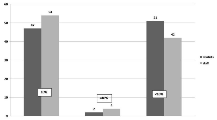 Figure 1 shows the percentage of dentists answered the questionnaire. Only 11% dentists were fully aware about the type of sharps used in the dentistry. 4% of the dentists consider that gloves not necessary during the time of injection, though gloves are necessary as they provide primary barrier. 79% of the dentists always prefer to wear gloves during the time of injection. Figure 2 shows the percentage of dentist and staff exposed to needlestick injuries/sharp instrument injury. Most of the dentist and staff were exposed to needlestick injuries approximately 10% or less than 10% incidental rate.