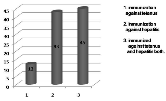 Figure 3 shows the percentage of dentists immunized against titanus and hepatitis. Only 3% dentist had answered positively for the patient had history of blood borne disease after needlestick injury/sharp instrument injury contaminated with blood and the precautions taken was only by first aid measures. Though 78% were ignorant for the correct method of first aid measures and they used to stop the bleeding and then washing with water which is not a correct method. 45% of the dentists were immunized for the tetanus and hepatitis both. 12% of the dentists were not immunized for the hepatitis. Most of the dentists (46%) consider HIV to be most infectious when compared with hepatitis B and hepatitis C.