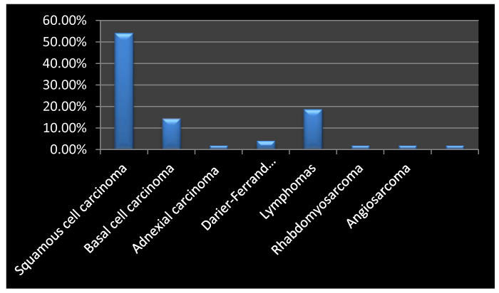 Facial cancers were dominated by Squamous Cell Carcinomas (SCC), observed in 26 cases (54.2%). It was followed respectively by Primary Cutaneous Lymphoma (PCL) (9 cases, 18.75%), Basal Cell Carcinoma (BCC) (7 cases, 14.6%), Darrier Ferrand dermatofibrosarcoma (DFS) (2 cases, 4.2%). Rhabdomyosarcoma, adnexal carcinoma, melanoma and angiosarcoma were observed in 1 case each (2%) (Figure 1).