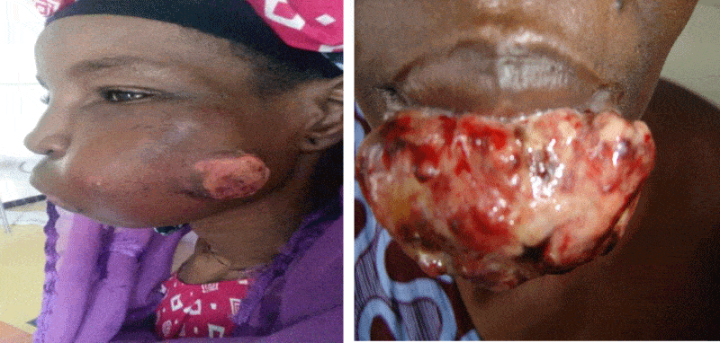 Two cases of DFS on the cheek were found, corresponding to 9.1% of the 22 cases of DFS observed during the same period. A case of eccrine adenocarcinoma, rhabdomyosarcoma, melanoma and a case of primary angiosarcoma were also observed (Figure 6).