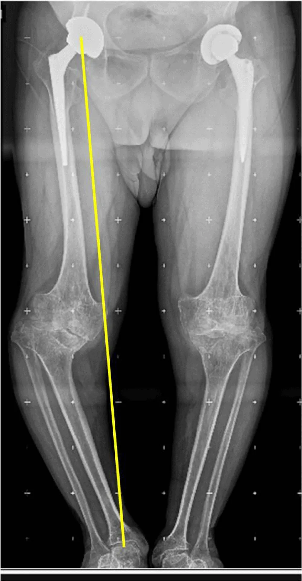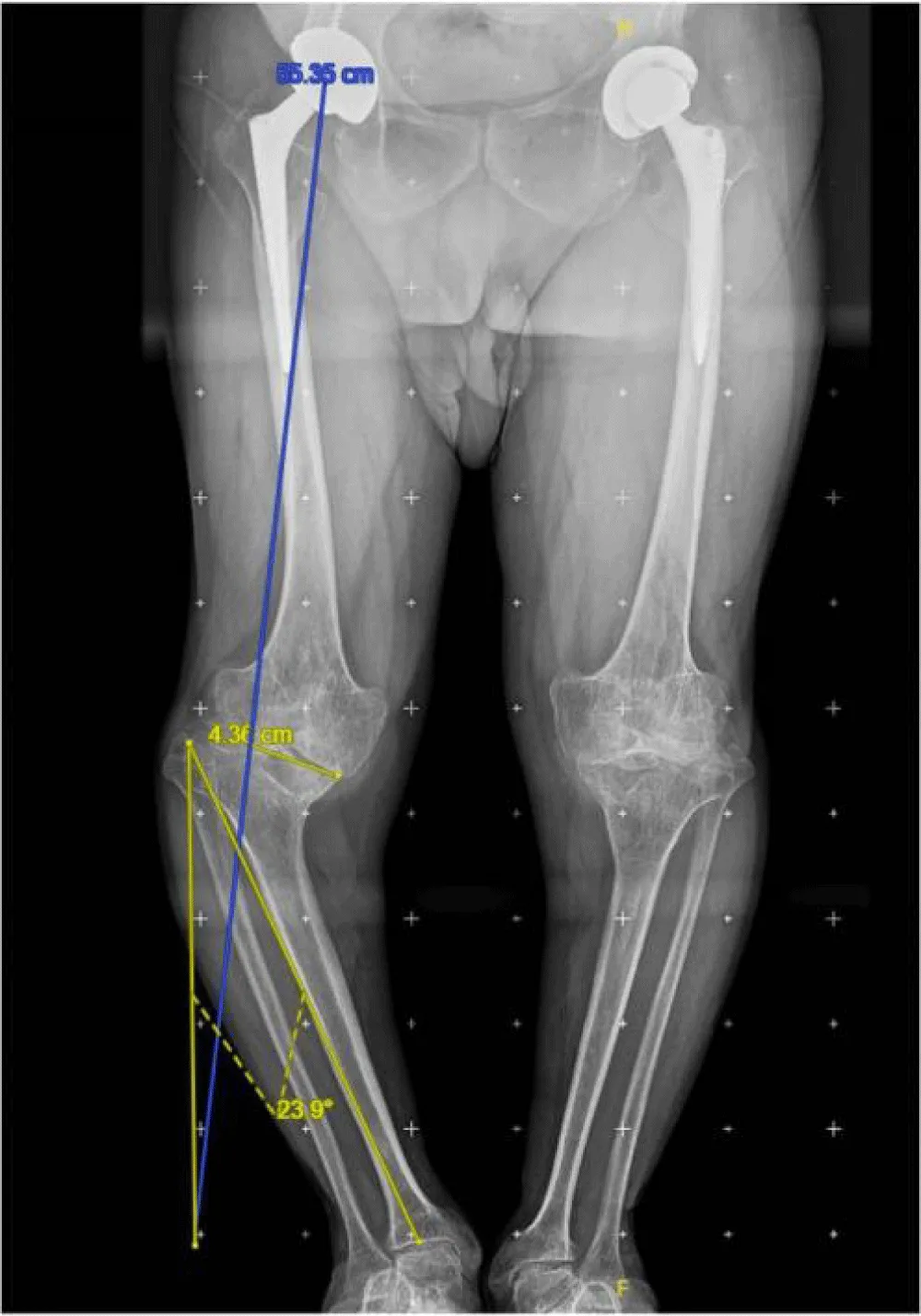 During the physical examination, the patient’s height was measured at 1.22 meters, weight at 46 kilograms, and body mass index was calculated to be 22.1. The right knee showed severe malalignment with a 36.4° extra-articular varus deformity, multidirectional instability, and a range of motion from 0° to 80°. The left knee displayed clinical and radiological signs of moderate osteoarthritis, with minimal discomfort. There were no discrepancies in the length of the lower limbs. In addition, he had previously undergone bilateral total hip arthroplasty, with satisfactory clinical results.