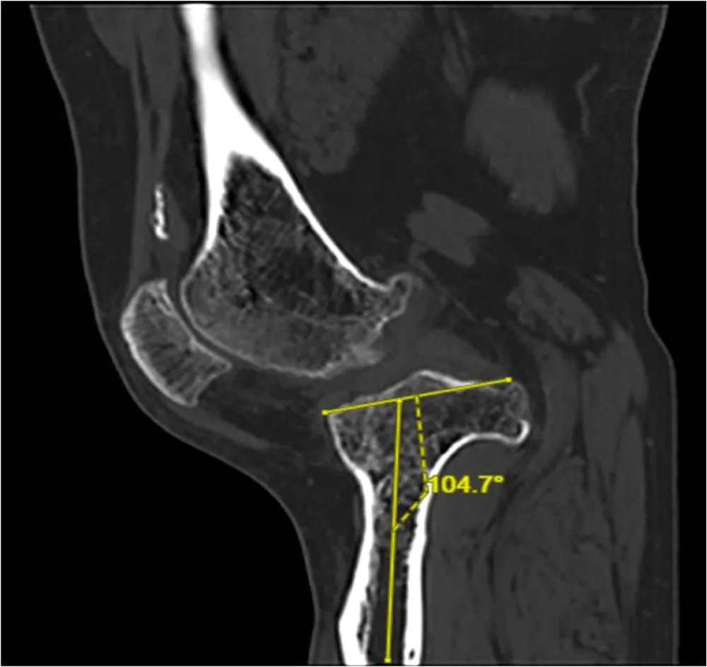 X-rays reveal severe deforming osteoarthritis of the right knee with a medial tibial metaphyseal angle of 53.6° (Figure 1). Telemetry shows medialization of the weight-bearing axis of the right lower extremity due to severe genu varum (Figure 2). Computed tomography (CT) confirms joint destruction with varus deformity of the proximal tibia (Figure 3), and severe misalignment of the posterior tibial slope (Figure 4).