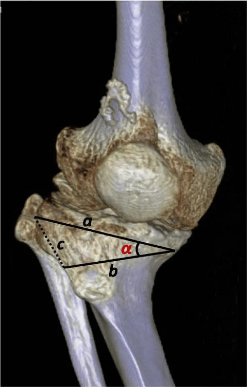 Given the sides a and b (measured in the AP projection of the last preoperative X-ray) and the angle C between them (calculated using the Miniaci method), the cosine theorem (Figure 6) must be applied to calculate side c (Figure 7).