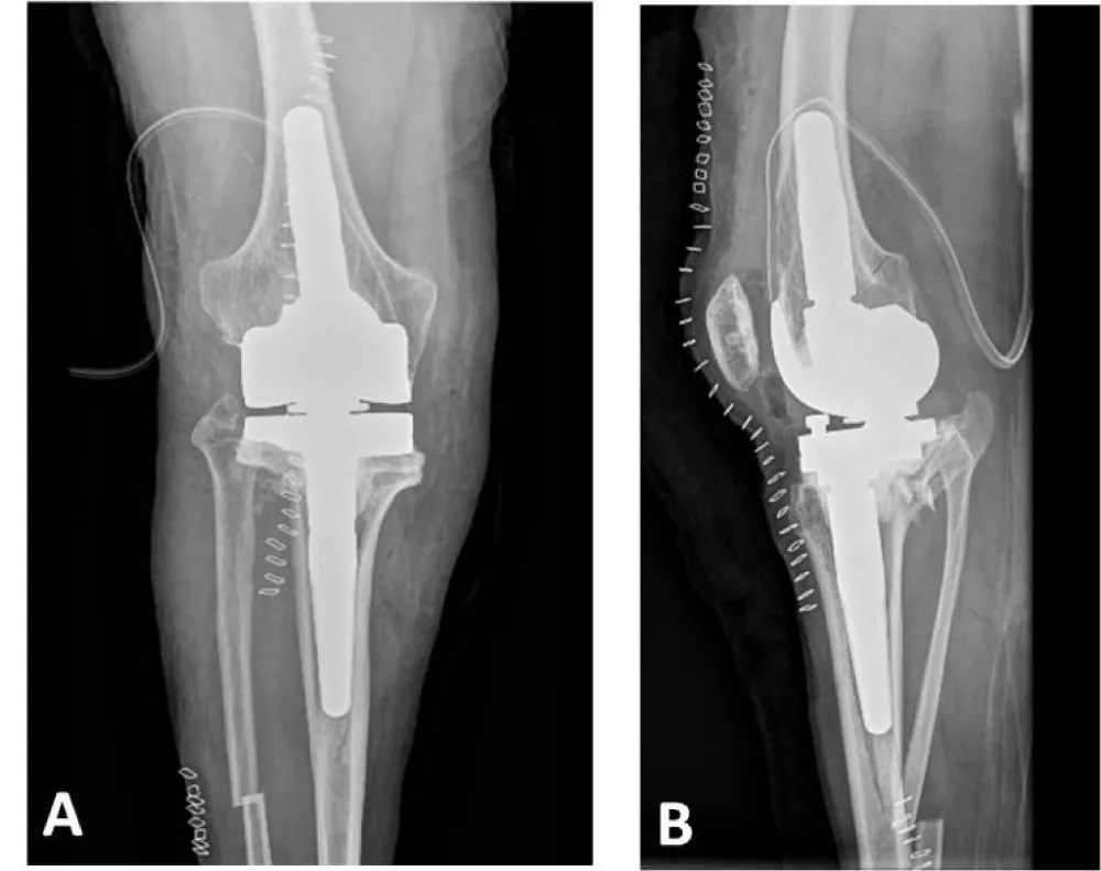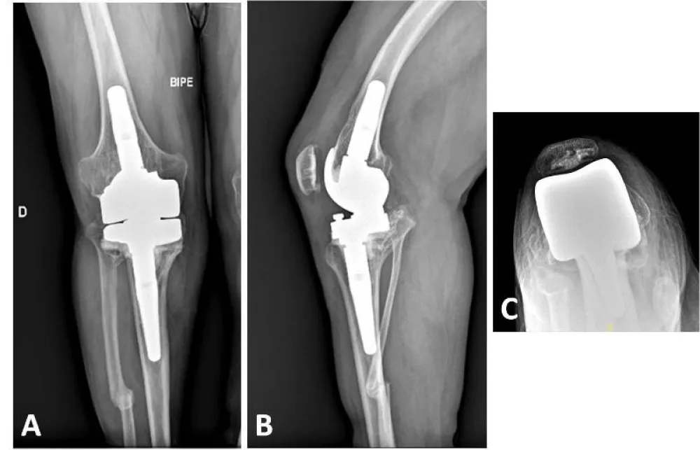 After surgery, the knee’s functional recovery began with physical therapy sessions. The postoperative X-ray revealed a fissure line distal to the tibial stem, so weight-bearing was prescribed for 4 weeks, with full weight-bearing permitted starting in the 5th postoperative week.