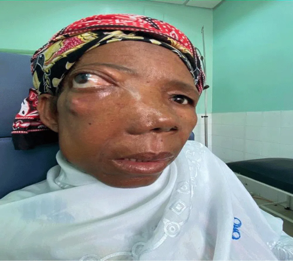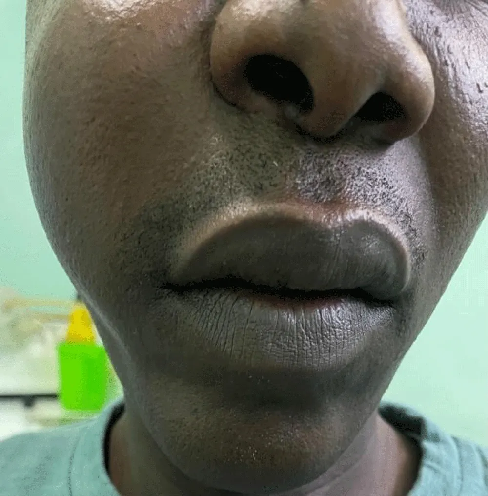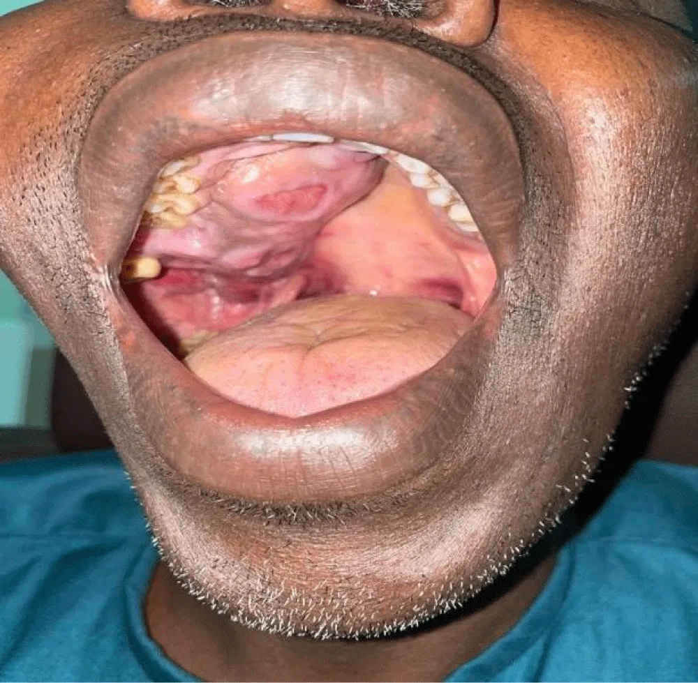 The average duration of symptoms before diagnosis was 15 months. The most common clinical signs were nasal obstruction (70%), followed by palatal swelling (Figure 1) or cheek swelling (63%) (Figure 2), an endonasal mass (48%), and epistaxis (41.7%). In advanced cases, ophthalmological signs such as exophthalmos or decreased visual acuity were observed in 22.22% of cases (Figure 3). At admission, 70% of patients had no palpable lymphadenopathy.