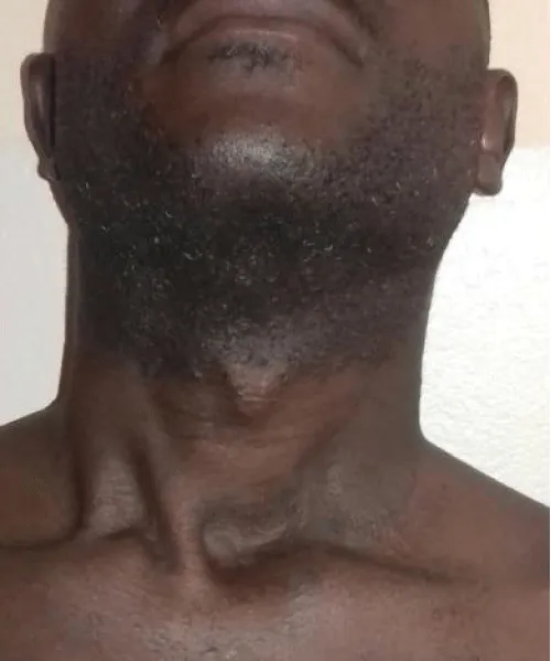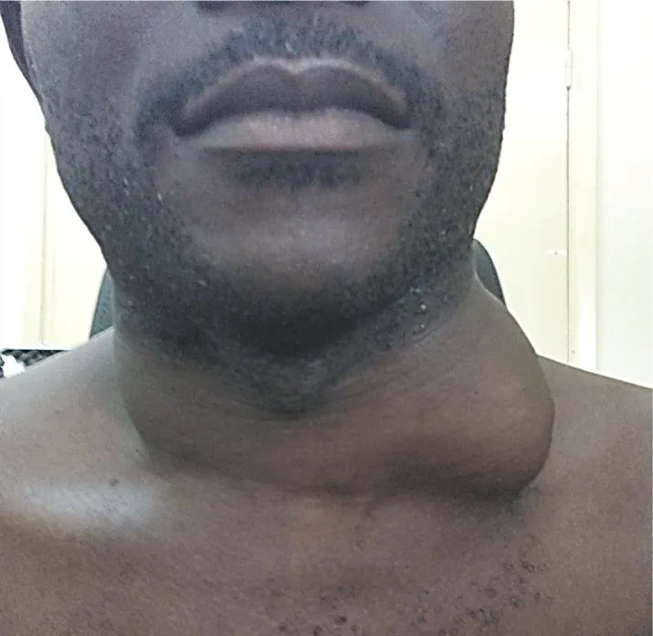 We report the case of a 40-year-old patient with no particular pathological history. He was received in December 2015 in our department for a bilateral lateral cervical mass gradually increasing in volume, without signs of compression or thyroid dysfunction. The whole evolving since approximately 3 months with a stability of the general state.