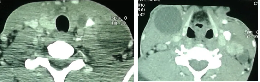Cervical CT scan showed two large cystic cervical lymph nodes, the left located being larger than the right one and the thyroid gland had multiple hypodense nodules (Figure 2).