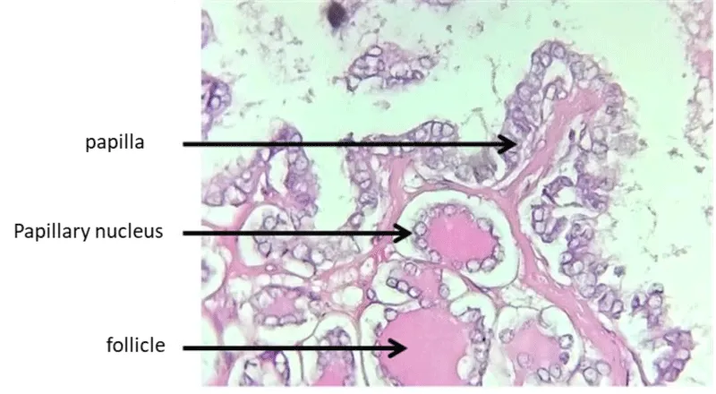 The histology of the operative specimen confirmed the diagnosis of papillary carcinoma of the thyroid (Figure 3b) with cystic lymph nodes metastasis.