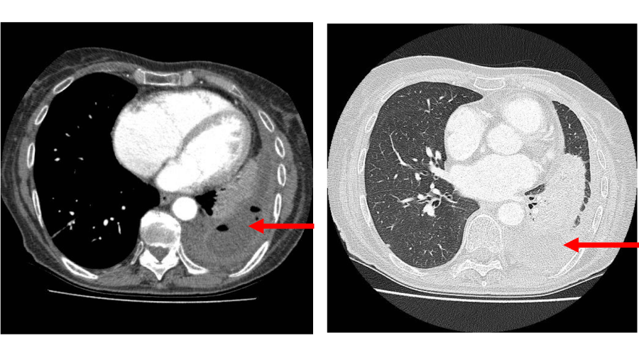 A review of the thoracic surgical database identified 75 patients who had undergone VATS drainage in the management of post-pneumonic empyema between May 2007 and May 2011. Patients requiring open drainage with rib resection, thoracoplasty or flap reconstruction were excluded from this study. Patients with an underlying thoracic malignancy were also excluded. The most common presenting symptoms were shortness of breath, fever and cough and were reported in 35-40% of cases. Others seen less frequently included chest pain, loss of appetite, loss of weight and haemoptysis. All patients had been resistant to medical treatment which varied from antibiotic therapy only, to pleural aspiration or drain insertion. The cohort was divided into those patients managed conservatively for less than two weeks prior to surgery (Group I n=34) and those managed for 2 weeks or more (Group II n=41). Diagnosis in both groups was confirmed using CT scan of the chest (Figure 1), with or without analysis of pleural fluid.