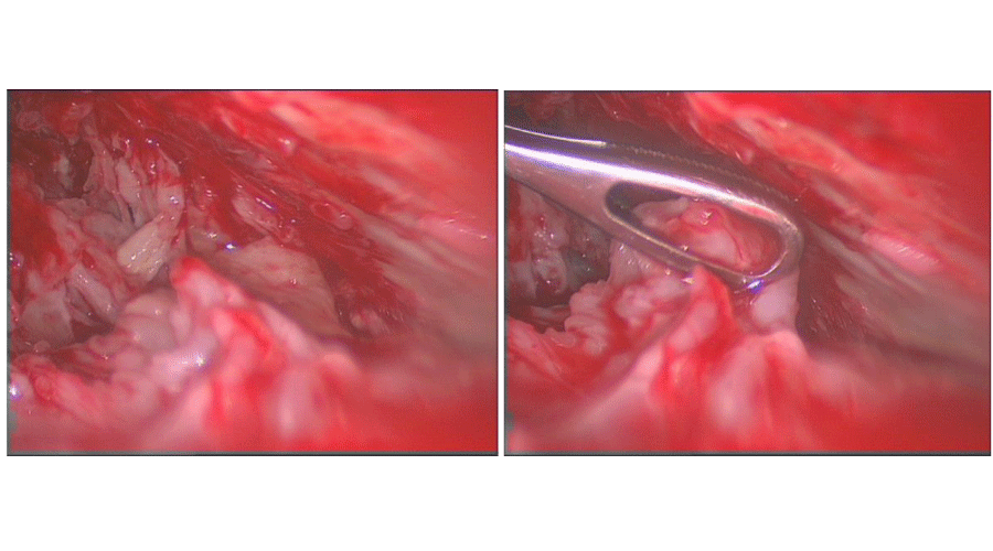 VATS empyema debridement was implemented initially in all cases using a standard two port technique, for simple loculated collections, and three ports where more extensive decortication was required. The inferior 10mm port is used for the camera while a larger anterior incision is used as a utility port. Following drainage of any effusion, the lung is mobilised from the chest wall using a combination of blunt dissection and diathermy for dense adhesions. Sponge-holding forceps can then be used via the utility port to remove fibrinous debris (Figure 2). Copious wash-out of the pleural cavity is performed using betadine solution. At the conclusion of the procedure a size 28 French chest drain is inserted to the apex via the utility port, while a size 32 French chest drain can be passed through the camera port to the base. The lung is re-inflated under direct vision prior to closure.
