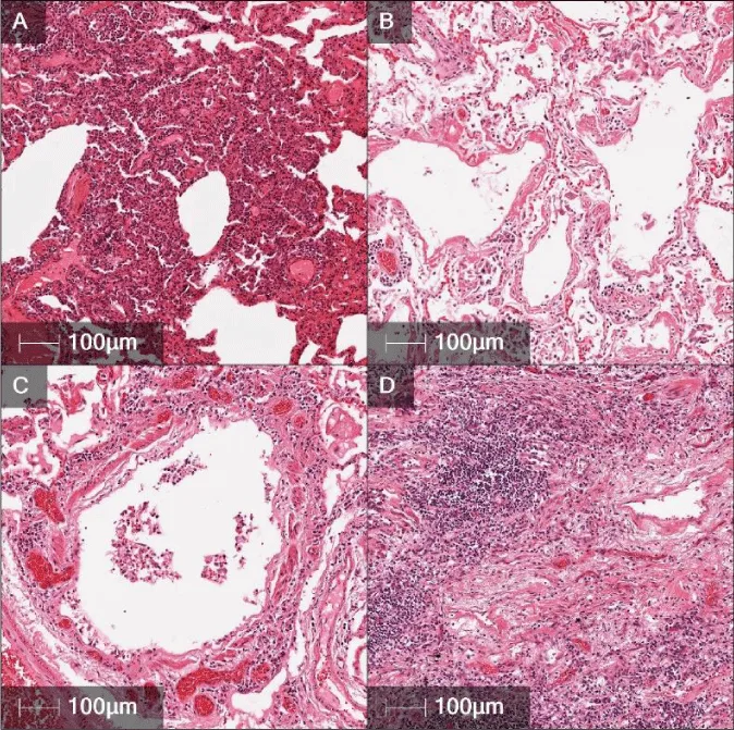 Bloom A, Colter A, Jacobsen M, Battles D, Sandusky G, et al. (2020) A Post-Mortem Examination of COVID-19 Pulmonary Pathology in 9 Cases. Arch Pulmonol Respir Care 6(1): 045-047. DOI: 10.17352/aprc.000051A new novel virus called SARS-CoV-2 has expanded into a pandemic in the past several months. The virus is an acute respiratory RNA virus that has symptoms in three clinical groups: asymptomatic, suspicious, and COVID-19 positive. The clinical lab testsused for diagnosis are Nasalpharyngeal swabs, with further testing done with sputum or BAL samples. Serological samples are collected for diagnosis in deceased patients using RT-PCR. The clinical symptoms usually occur 2 to 14 days after exposure and include fever, dry cough, and fatigue. In some cases, symptoms can progress and cause multiple organ failure due to adult respiratory distress syndrome (ARDS). The virus is in the family of coronaviruses and has also been identified in lung tissue using transmission electron microscopy. Gross and microscopic lung pathology was examined in five positive cases and four negative cases by hematoxylin and eosin (H&E) and Masson’s Trichrome stains. Of the collected, the age range was 28 to 76. The ethnicities were six Caucasians and three minorities, with a male to female ratio of 7:2. The salient histology features seen in the study were multifocal to diffuse alveolar necrosis, bronchiolar epithelial necrosis, and interstitial mononuclear lymphocytic infiltrates. Other features were perivascular and peribronchiolar lymphoid infiltrates and marked congestion. Scattered fibroplasia was found in the damaged alveoli and the alveolar septae in the more severe cases. These pathologic features are similar to other coronaviruses.