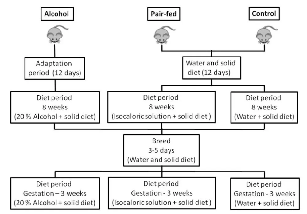 Firstly, the liquid diet of isocaloric group (Pair-fed group) was not strictly controlled, although nutritional pairing was accomplished regarding the solid food. Moreover, the extent of the pups’ exposure to alcohol during the breastfeeding period was not assessed. Despite these limitations, this kind of methodology have been well accepted in the scientific environment [14,16,18,19,26,27,51].