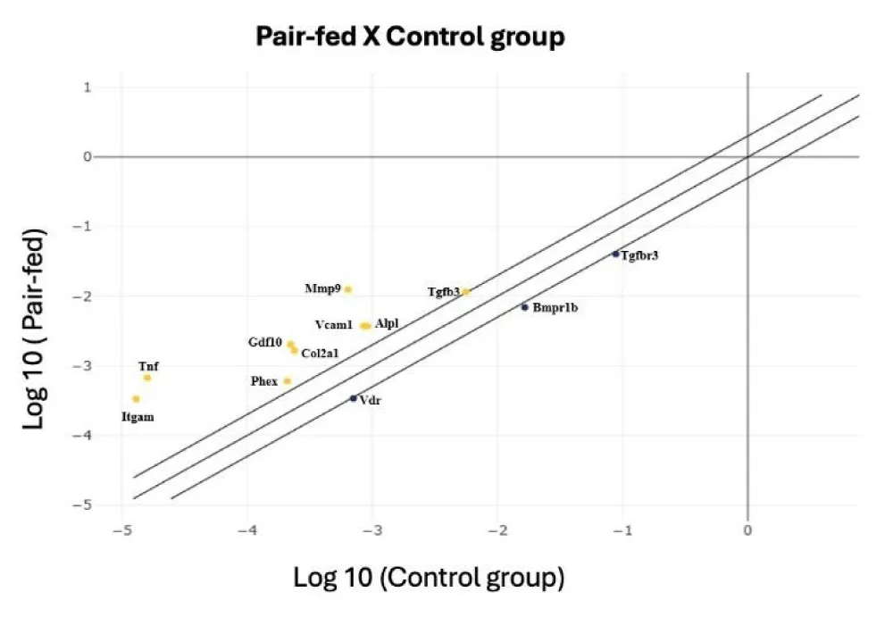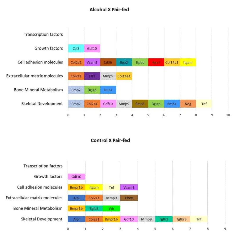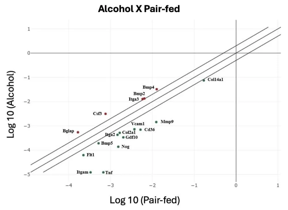 In comparison to the Control group, the Pair-fed group exhibited significant (p < 0.05) downregulation of the Bmpr1b, Tgfbr3, and Vdr genes and upregulation of Alpl, Col2a1, Gdf10, Itgam, Mmp9, Phex, Tgfb3, Tnf, and Vcam1 genes (Table 2 and Figure 3). Out of the 84 analyzed genes associated with skeletal development, growth, and metabolism, 17 genes exhibited significant alterations in their expression when compared between the Alcohol and the Pair-fed groups. Most of these genes demonstrated downregulation in the Alcohol group relative to the Pair-fed group, including Bmp5, Cd36, Col14a1, Col2a1, Flt1, Gdf10, Itga2, Itgam, Mmp9, Nog, Tnf, and Vcam1. Conversely, Bgla, Bmp2, Bmp4, Csf3, and Itga3 were upregulated in the Alcohol group compared to the Pair-fed group. Detailed expression and statistical results for all genes are presented in Table 2 and Figure 4 (the comparative analysis between the Control and Alcohol groups is presented in the supplementary material - Table 3).