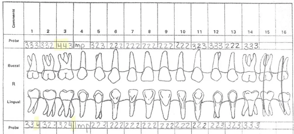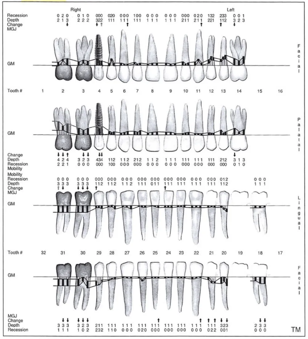 Figure 1 shows the periodontal chart transferred from his previous practice and adopted as the baseline at his first visit in April 2016. At that time, probing depths were largely 2–3 mm, though isolated 4 mm pockets were noted around teeth 2, 3, 30, and 31, with recorded mild bleeding on probing. In contrast, several teeth, particularly in the facial region, demonstrated improved pocket depths, though mild inflammation and plaque accumulation persisted. These findings reflected localized disease but overall periodontal stability consistent with his long-standing care.