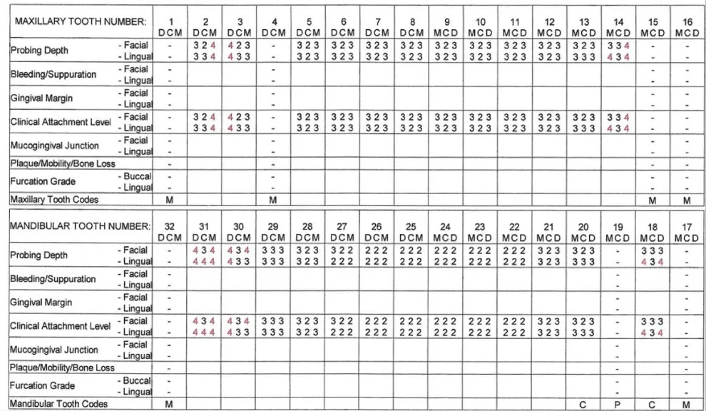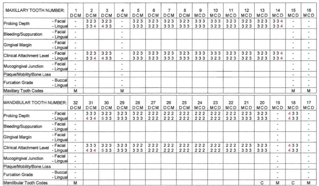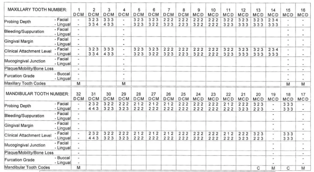 In April 2021, probing depths of 4 mm were again detected in select posterior sites, reflecting areas of localized concern. However, when compared with the 2019 chart (Figure 3), the overall findings demonstrate stability in most sites, with most probing depths maintained at 2–3 mm and attachment levels preserved. A transient increase in probing depth to 5 mm was observed at isolated sites, but with improved self-care and routine SRP, these measurements later reduced to 4 mm, reflecting a return to stable periodontal status.