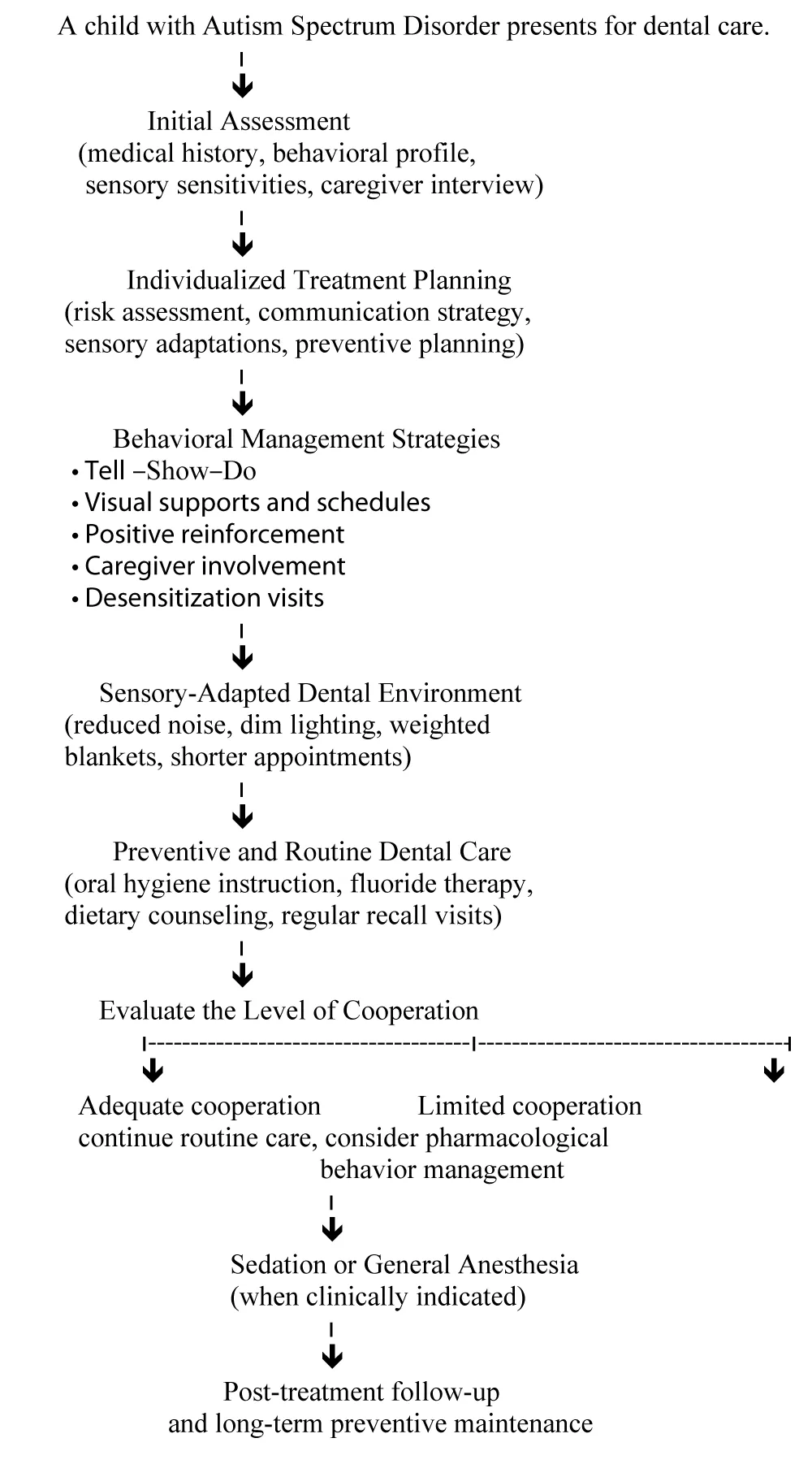 Clinical pathway for dental management of children with Autism Spectrum Disorder, illustrating the steps from initial assessment and individualized treatment planning to behavioral management strategies, preventive care, and the use of sedation or general anesthesia when indicated (Figure 1).