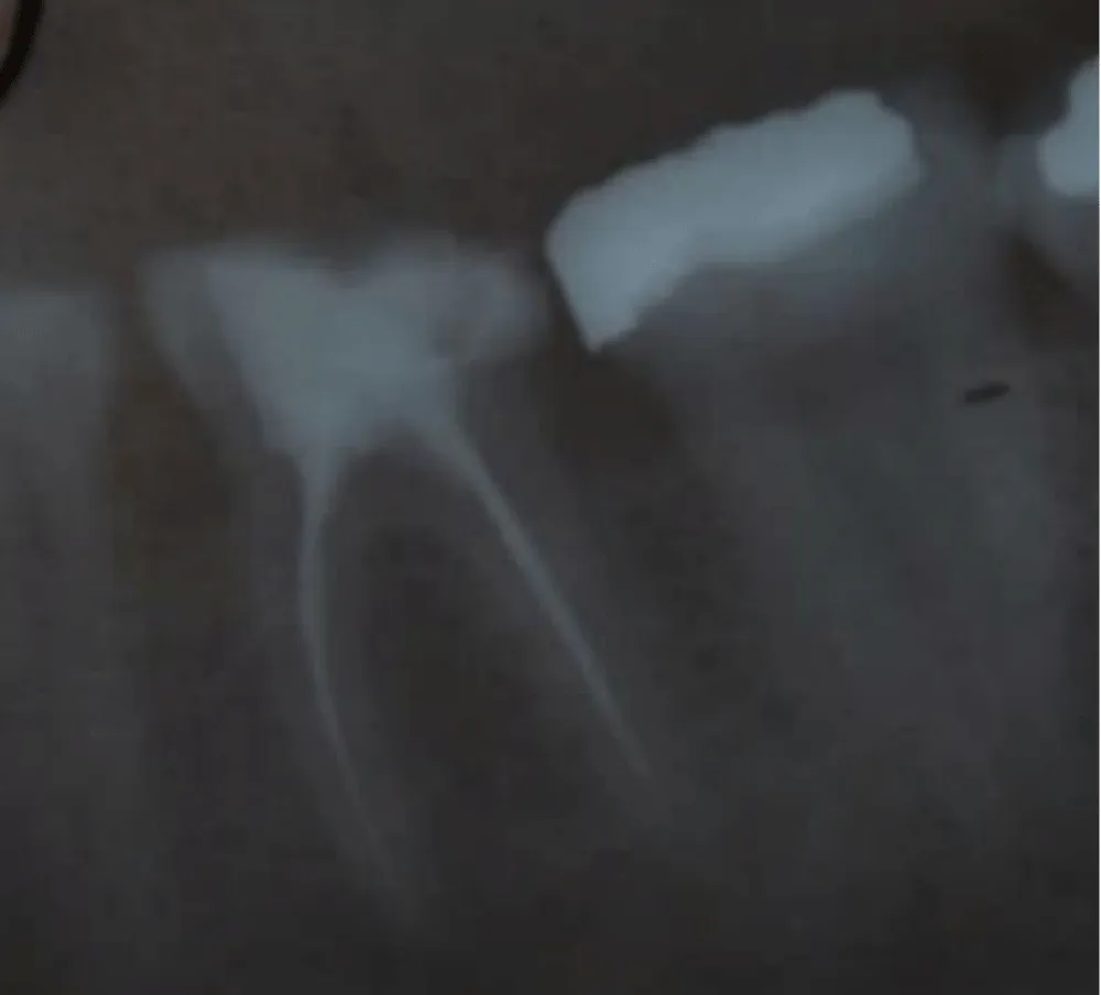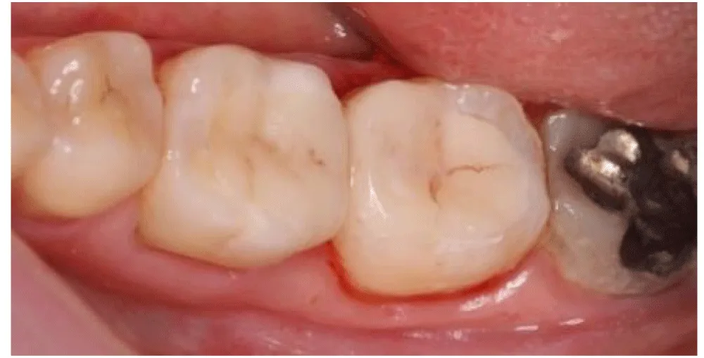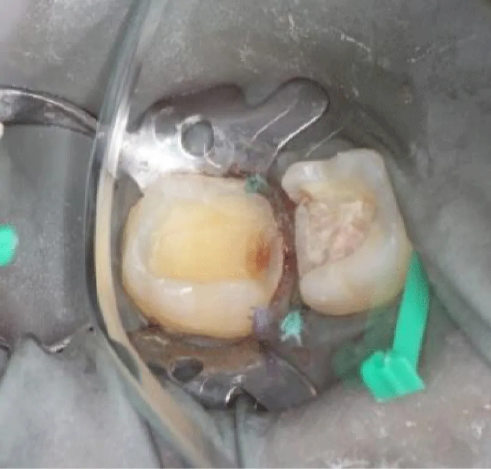 Radiographic evaluation confirmed the extent of structural loss. It demonstrated adequate endodontic treatment on the first molar, but insufficient coronal support (Figure 3). The second molar was vital. It also confirmed the lack of the natural interproximal contour, explaining the chronic irritation and pain which increases during mastication.