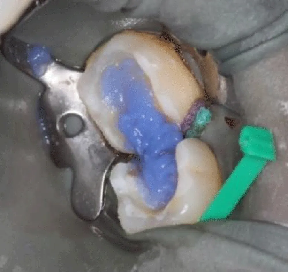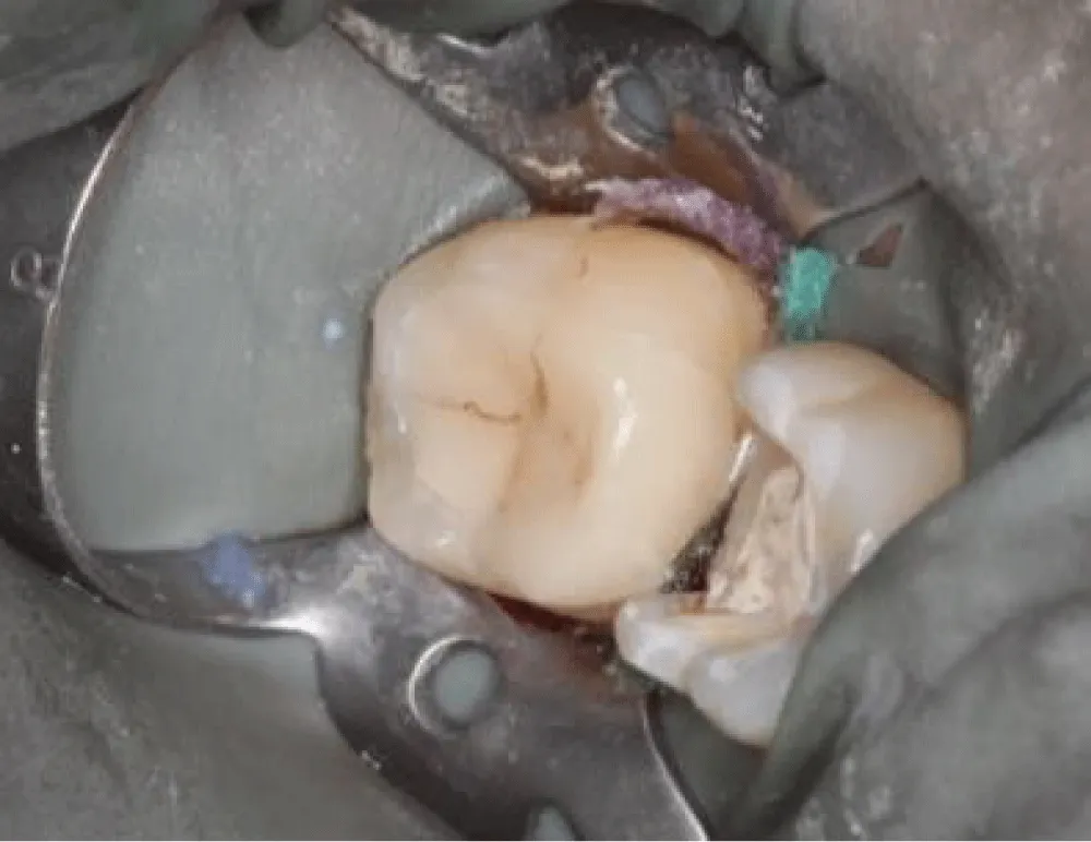 Sufficient enamel was preserved at the margins because bonded margins to enamel give superior and more durable adhesion. Deep Margin elevation was performed in the first molar. During the stage of cementation, Restorations were etched (hydrofluoric acid for ceramics) and silanized. Tooth surfaces were selectively etched, and a universal adhesive was applied. Duale Resin cement was used for bonding under controlled isolation (Figure 5-7). Restorations were finally light-cured from all aspects, and glycerin was applied in the margins to protect the marginal fit (Figure 8). At the 2-week follow-up, the patient reported complete disappearance of pain. No bleeding was observed during hygiene procedures. The interproximal area was restored, and the architecture was established with a continuous adhesive surface and optimal marginal integrity (Figure 9).